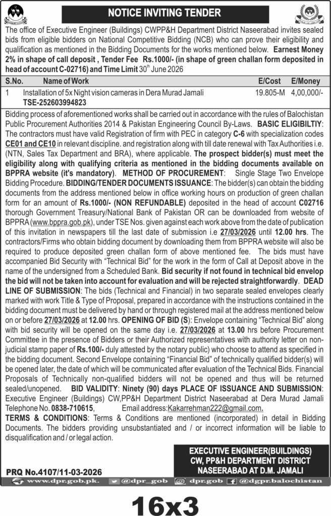 The submission deadline is set for 27th March 2026 at 12:00 PM, with bid opening scheduled the same day at 1:00 PM. Bids must be delivered by hand or registered mail to the Executive Engineer (Buildings) CWPP&H Department District Naseerabad at Dera Murad Jamali. Interested bidders should obtain bidding documents by depositing a non-refundable fee of Rs.1000 through a green challan form.