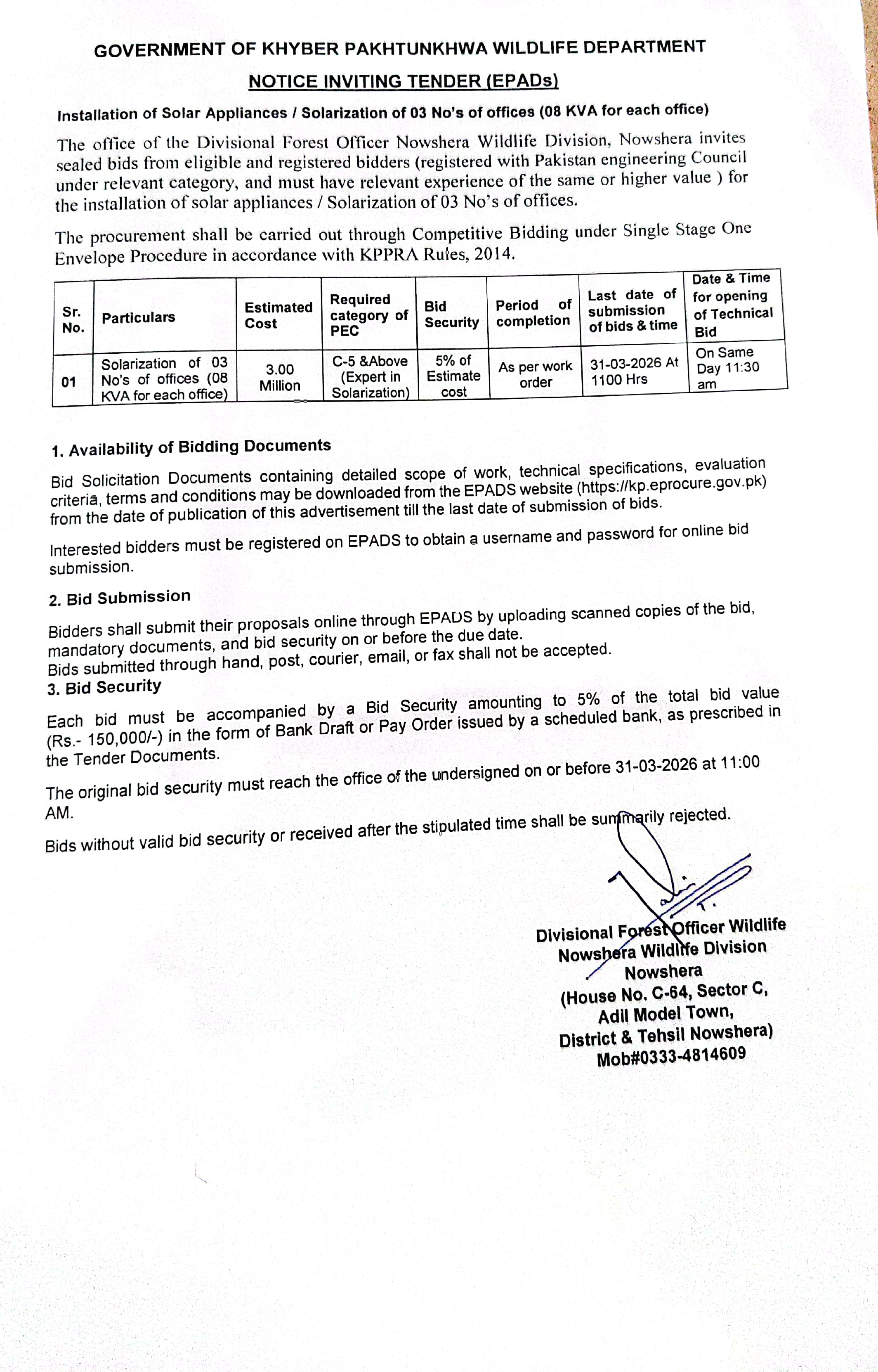 This tender invites bids for the installation of solar appliances across three offices in Nowshera, each equipped with an 08 KVA solar system. The Government of Khyber Pakhtunkhwa Wildlife Department requires expert contractors registered with the Pakistan Engineering Council under the relevant category to undertake this solarization project.
