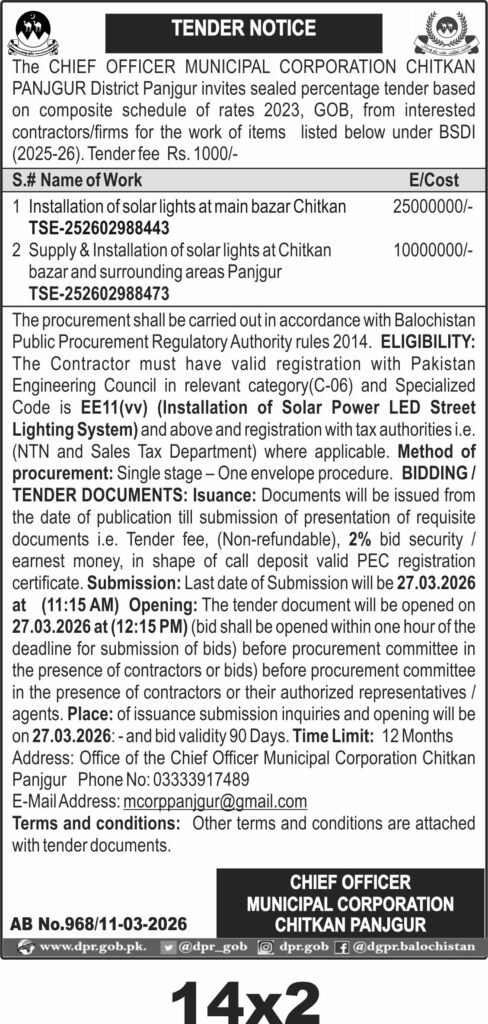 Submission deadline is set for 27 March 2026 at 11:15 AM, with bid opening at 12:15 PM the same day. Bids will be opened in the presence of contractors or their authorized representatives at the office of the Chief Officer Municipal Corporation Chitkan Panjgur. Interested parties should prepare their technical and financial bids carefully, ensuring all documentation is complete.