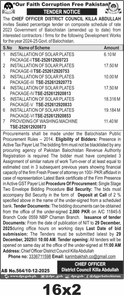 This tender invites sealed percentage bids for installation of solar plates and provision of washing machines in Killa Abdullah under development works for 2024-25. The procurement covers multiple packages of solar plate installations and washing machine supply in Balochistan.