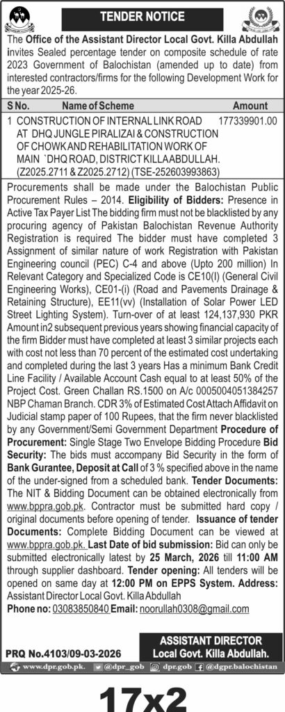 This tender invites contractors in Killa Abdullah for the construction of an internal link road at DHQ Jungle Piralizai and rehabilitation of the main DHQ road. The project falls under the Office of the Assistant Director Local Government and focuses on civil works involving road construction and structural repairs.