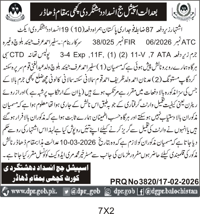 ποΈ Issuing Authority:Special Judge Anti-Terrorism Court Dhadar