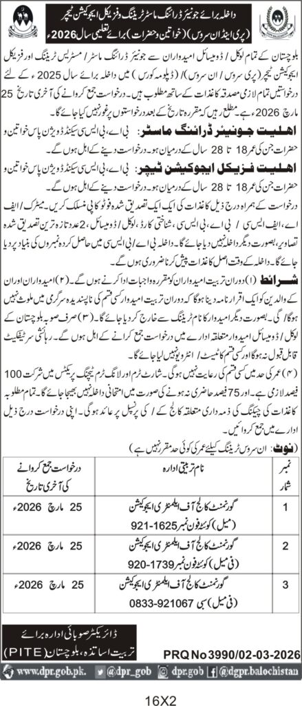 Junior and Physical Education Teacher Recruitment for 2025-26 at Government College of PITE Balochistan