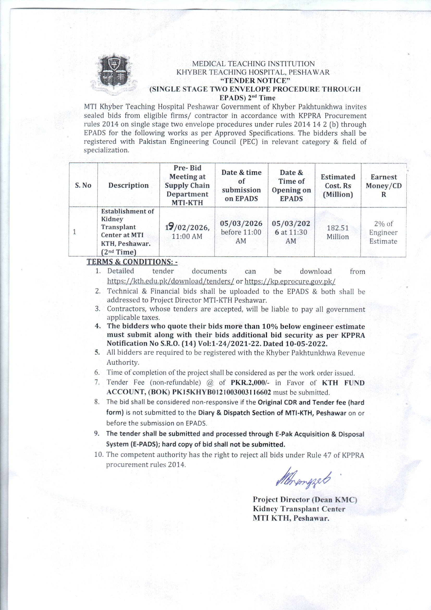 Bidders should ensure compliance with PEC registration and maintain an active FBR/ATL status for the fiscal year 2025-26. The tender requires earnest money as 2% of the engineer's estimate, and a non-refundable tender fee of PKR 2,000 must be submitted in favor of the KTH Fund Account. The procurement follows the KPPRA rules 2014, with strict adherence to submission guidelines.