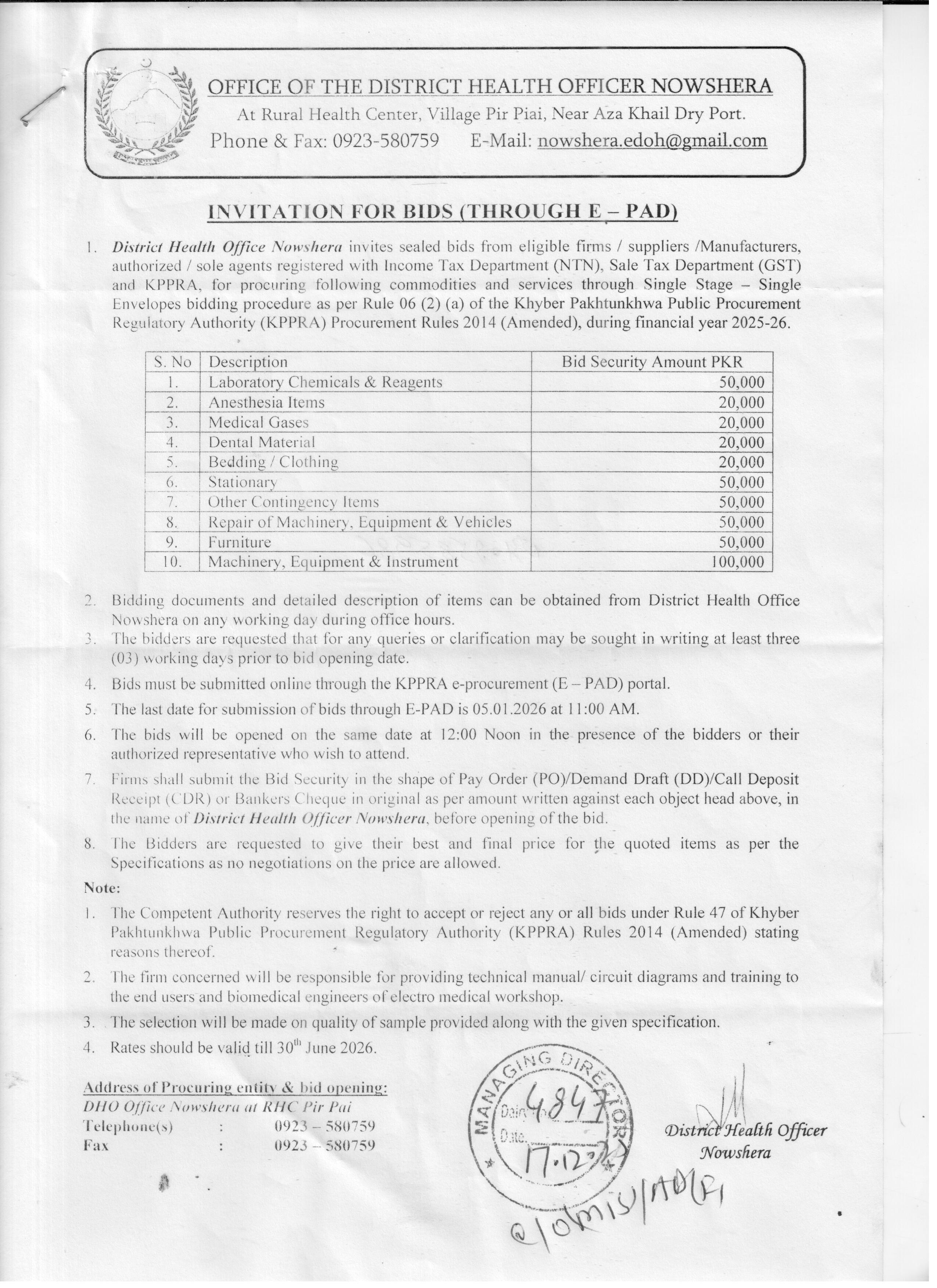 Bidding documents and detailed descriptions can be obtained from the District Health Office Nowshera during office hours. Bids must be submitted online through the KPPRA e-procurement portal (E-PAD) by 5th January 2026 at 11:00 AM. Bid security amounts vary by item category.