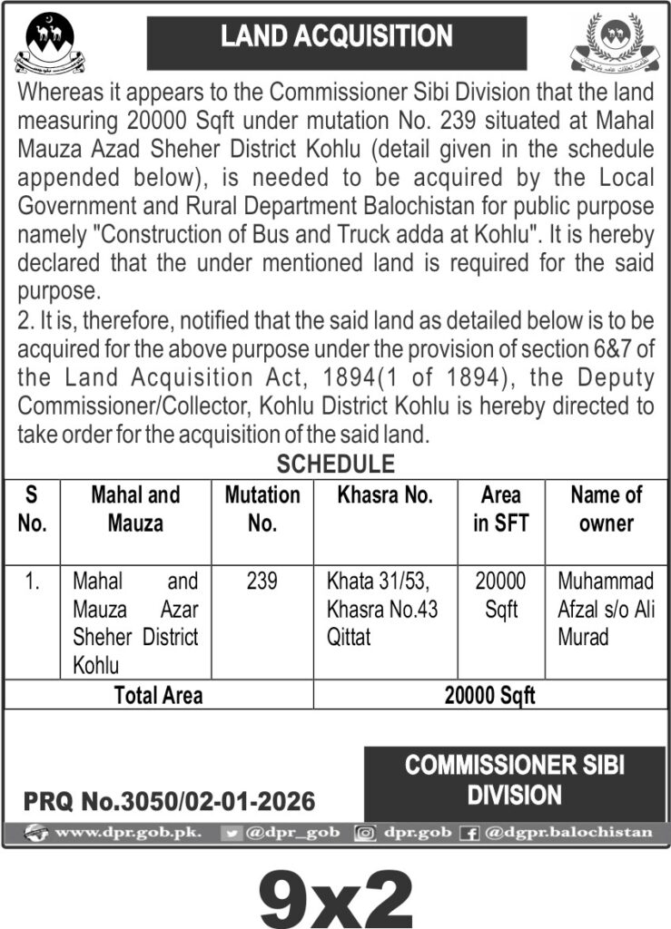 This tender notice from Kohlu city involves the Local Government and Rural Department Balochistan seeking land acquisition for a public infrastructure project under the Construction & Civil Works Materials category.