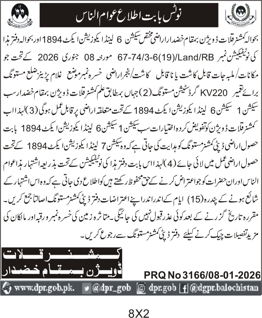 Land Acquisition for Section 6 Land Acquisition 1894 in Mastung District