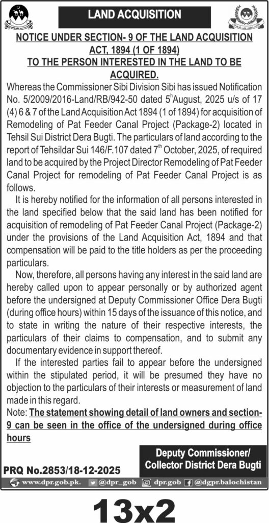 The Commissioner Sibi Division issued notification for land acquisition under the Land Acquisition Act 1894. The Deputy Commissioner Office Dera Bugti calls all interested persons to appear within 15 days to state their interests and claims for compensation. The land particulars are based on Tehsildar Sui report dated 7th October 2025.