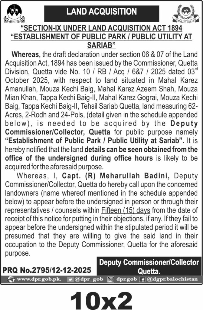This notice concerns land acquisition in Quetta for the establishment of a public park and public utility under the Land Acquisition Act 1894. The procurement involves acquiring land situated in various mahal areas of Sariab for public development purposes.