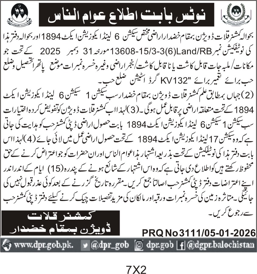 Land Acquisition for Section 6 Land Acquisition Act 1894 in District Hub