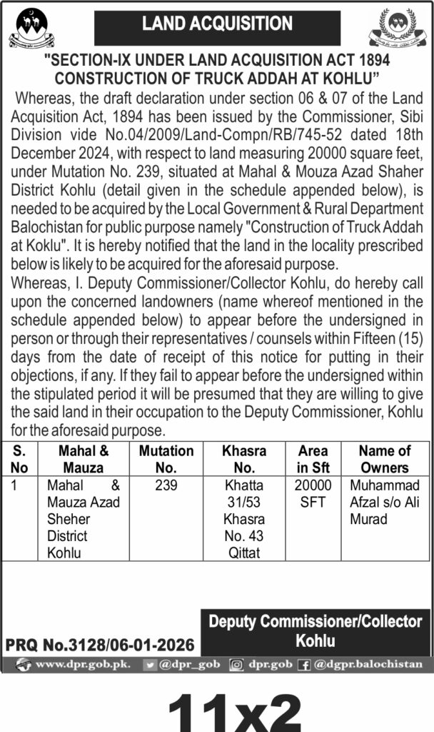This notice from the Local Government and Rural Department Balochistan in Kohlu concerns the acquisition of land for the construction of a Truck Addah. The project involves acquiring 20,000 square feet of land situated at Mahal & Mouza Azad Sheher in Kohlu District. This land acquisition is essential to facilitate the development of infrastructure aimed at improving local transport and logistics.