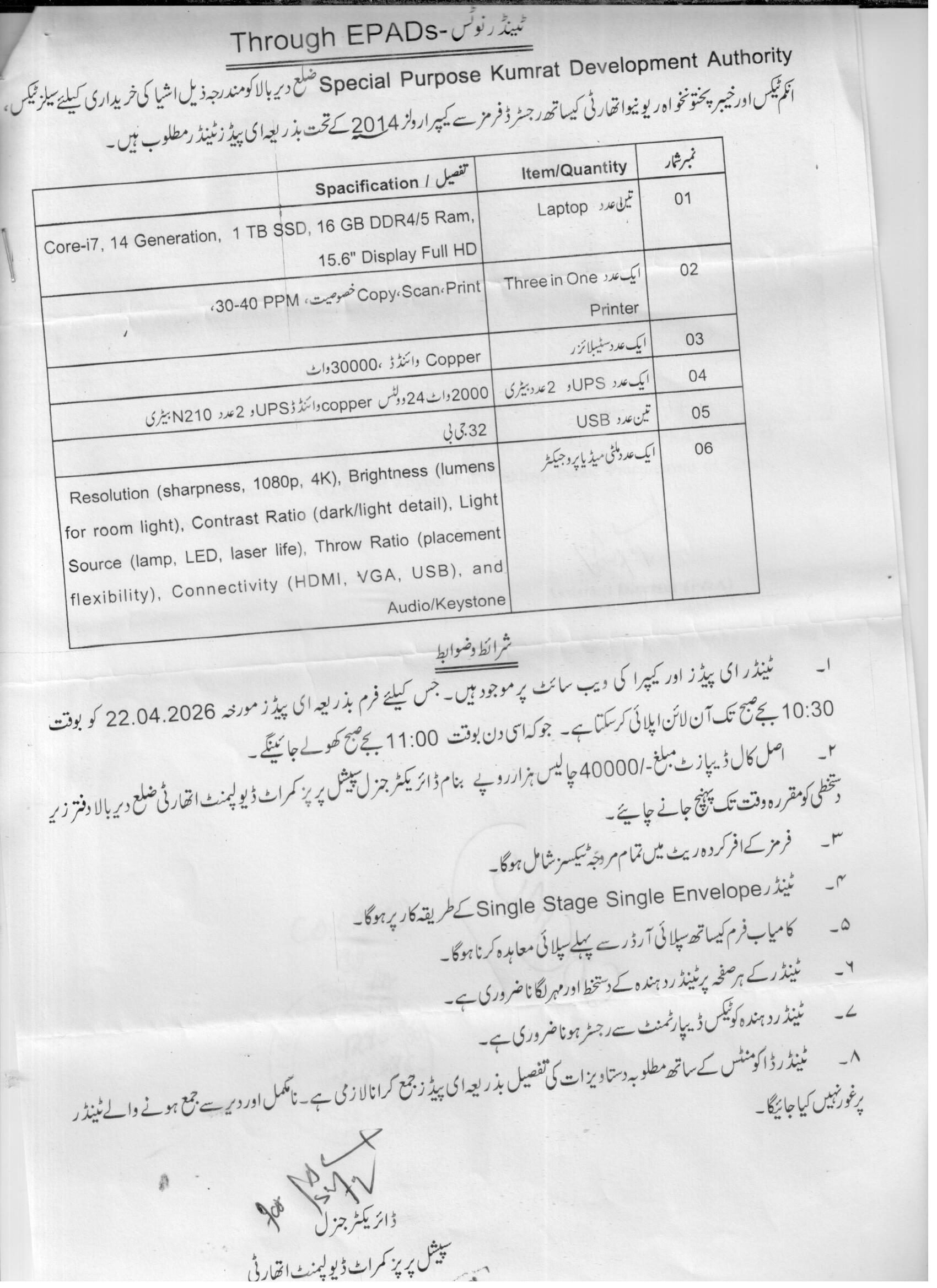 This procurement opportunity in Upper Dir by the Special Purpose Kumrat Development Authority focuses on acquiring essential IT and electronic equipment including laptops, three-in-one printers, UPS units, USB devices, and a multimedia projector. The tender covers high-specification items such as a Core-i7 14th generation laptop with 1 TB SSD and 16 GB RAM, and a multimedia projector with advanced resolution and connectivity features, aimed at enhancing the authority's operational capabilities.