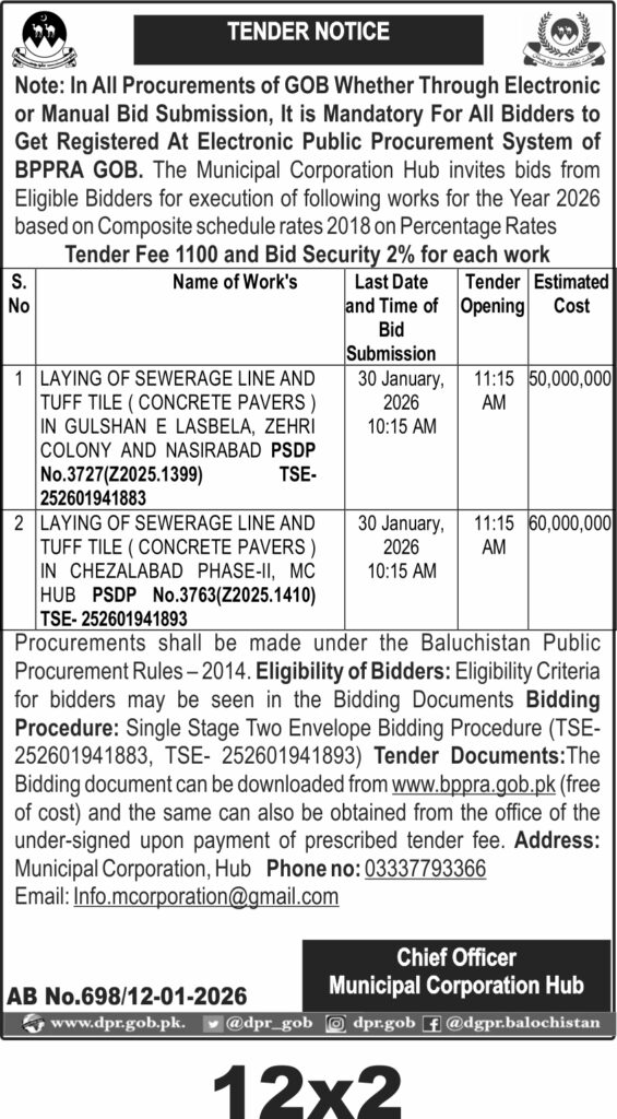 Bidders should hold a valid PEC registration in the relevant category and maintain an active FBR ATL status for the fiscal year 2025-26. Tender documents are available free of cost at the official BPPRA website and from the Municipal Corporation Hub office upon payment of the tender fee. Earnest Money in the form of a 2% Call Deposit Receipt (CDR) is mandatory.