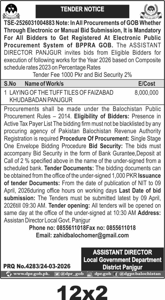 Submission deadline is set for 09 April 2026 at 09:30 AM, with tender opening at 10:30 AM the same day at the Assistant Director Local Government office in Panjgur. Bidders should prepare their technical and financial bids carefully, ensuring all documentation and security deposits are in order.