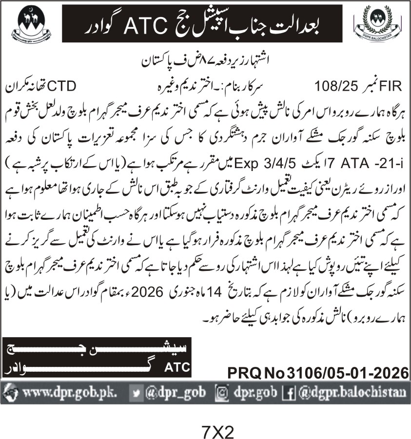 This notice from the Balochistan Police, Gwadar Anti-Terrorism Court (ATC) concerns legal actions related to a terrorism case involving suspects from the Baloch community. The department in Gwadar requires services related to the issuance and execution of arrest warrants for individuals accused of terrorism under case FIR 108/25. The scope involves coordination with law enforcement to ensure proper legal procedures are followed in the apprehension of suspects.