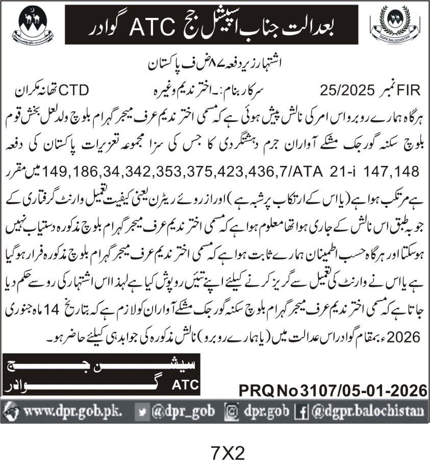 The case involves multiple sections of the Anti-Terrorism Act and other relevant laws, with the Gwadar police tasked to ensure the arrest and prosecution of the accused. The notice highlights the importance of maintaining procedural integrity and the quality of warrants issued, reflecting the sensitive nature of security operations in Gwadar.