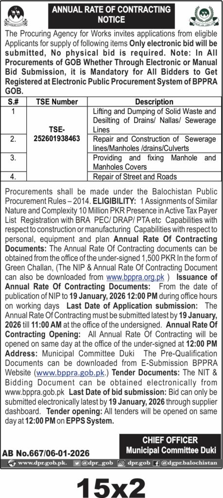 The submission deadline is set for 19 January 2026 at 11:00 AM, with bid opening scheduled the same day at 12:00 PM at the Municipal Committee Duki office. Bids must be submitted electronically through the BPPRA supplier dashboard, and all bidders must be registered on the Electronic Public Procurement System of BPPRA.