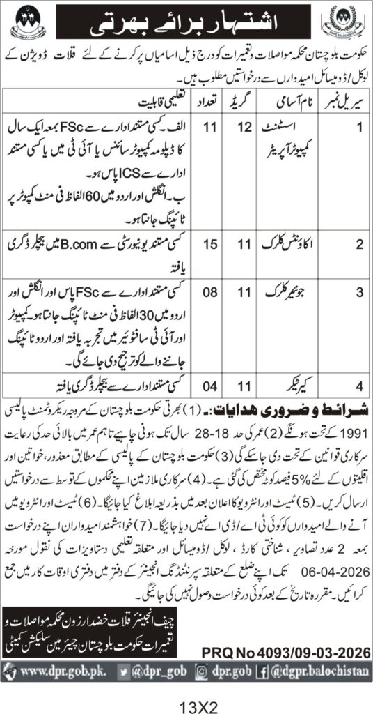 This recruitment drive by the Balochistan Public Works Department in Quetta focuses on hiring qualified staff for the Local Road Division. The positions include Assistant Computer Operator, Accounts Clerk, Junior Clerk, and Caretaker, each requiring specific educational qualifications and skills such as computer typing in English and Urdu. The department seeks candidates with FSC or equivalent qualifications and relevant experience, emphasizing proficiency in computer applications and administrative tasks.
