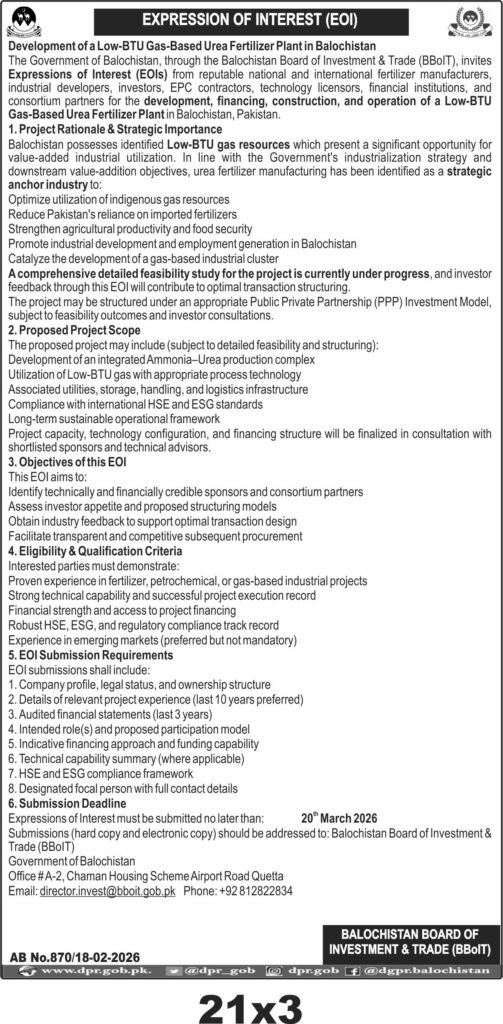 This tender invites Expressions of Interest for the development of a Low-BTU Gas-Based Urea Fertilizer Plant in Quetta, Balochistan, issued by the Balochistan Board of Investment & Trade (BBoIT). The project falls under Construction & Civil Works Materials and Agricultural Inputs & Equipment categories.