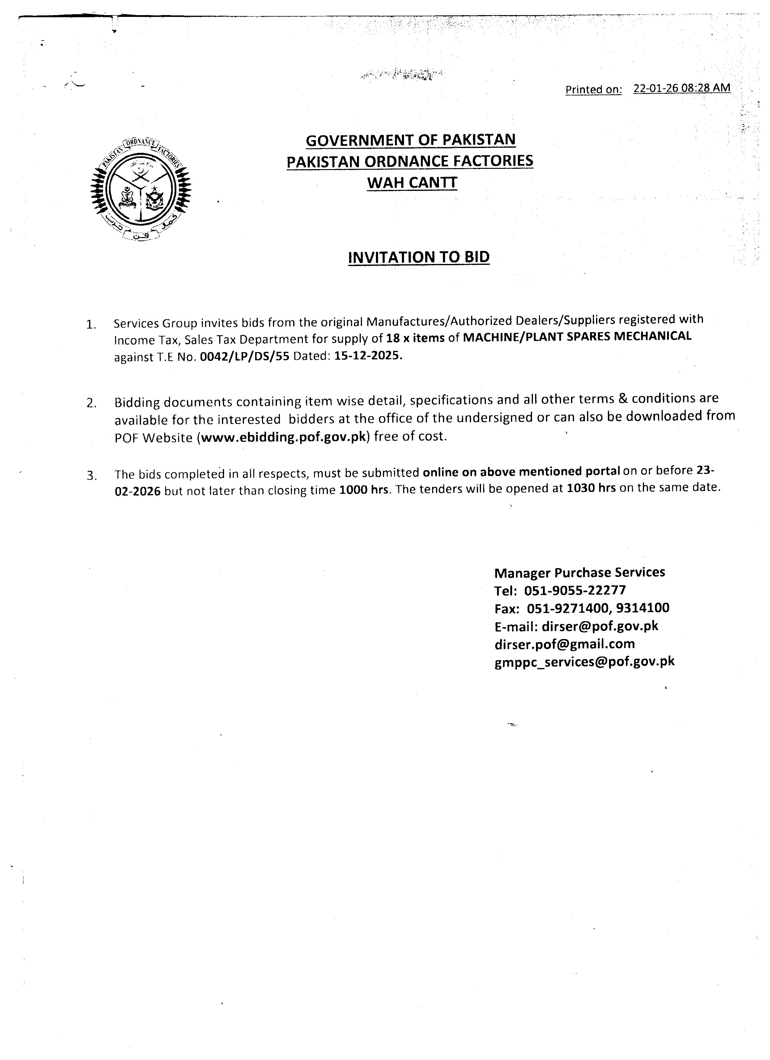 The submission deadline is set for 23rd February 2026 at 10:00 AM, with bid opening scheduled at 10:30 AM on the same day. Bidders must submit their proposals online via the official POF e-bidding portal. For physical correspondence or inquiries, the Pakistan Ordnance Factories office in Wah Cantt remains the primary contact point.