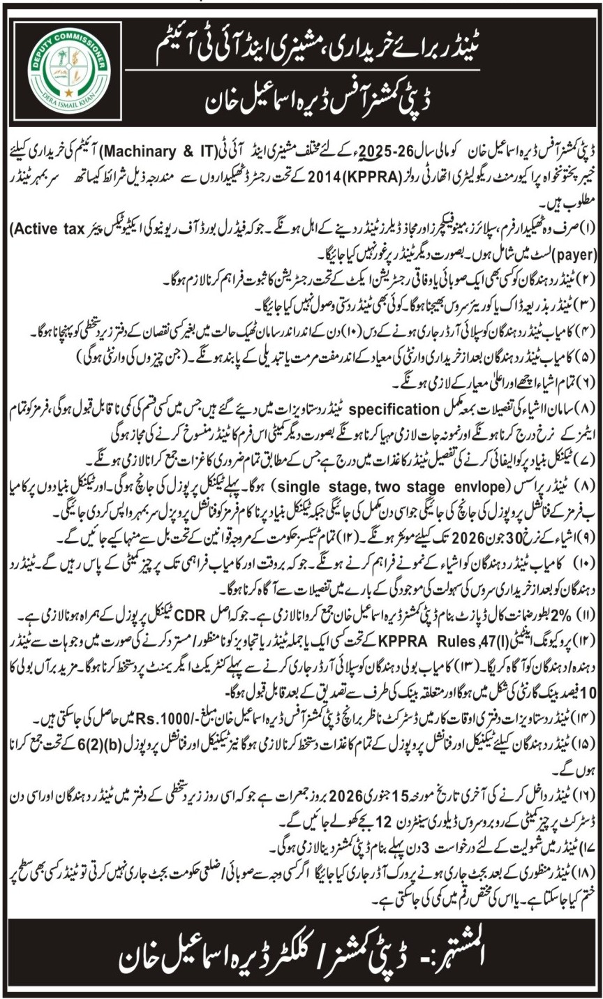 This tender invites bids for the procurement of various machinery and IT equipment for the Deputy Commissioner Office in Dera Ismail Khan under KPPRA rules 2014. Bidders must comply with tax and registration requirements.