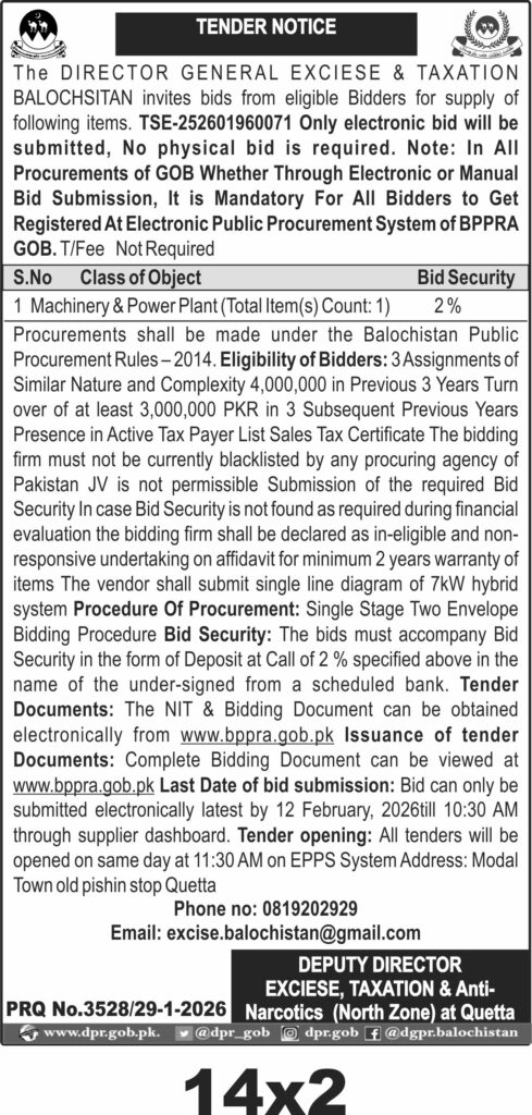 Supply of Machinery and Power Plant Equipment for Excise and Taxation Balochistan