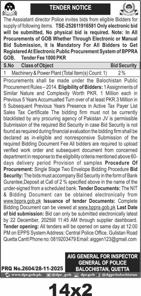 The Police Department in Quetta invites electronic bids for the supply of machinery and power plant equipment under Balochistan Public Procurement Rules. The tender requires bidders to submit bids electronically through the BPPRA system by the specified deadline. The procurement is focused on machinery and power plant items for official use in Quetta, Balochistan.