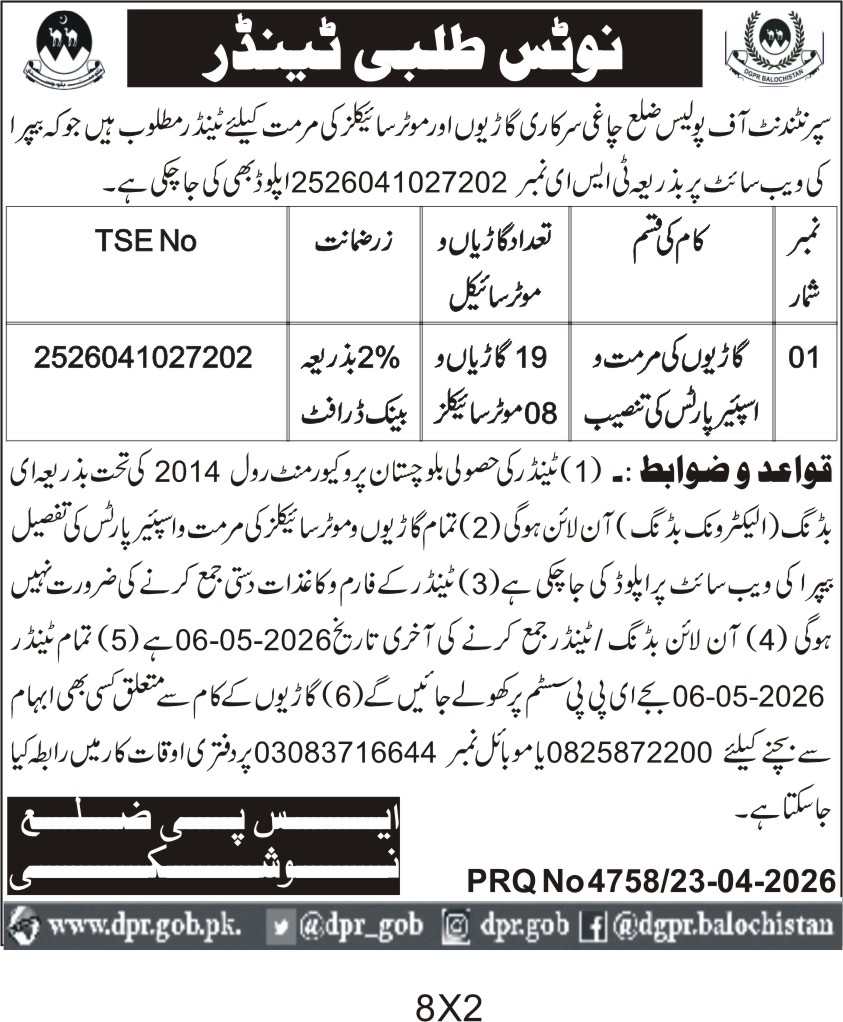 The Superintendent of Police District Chagai is seeking qualified contractors for the maintenance and repair of government vehicles including cars and motorcycles. This procurement is specifically for the upkeep and servicing of 19 cars and 8 motorcycles, ensuring their operational efficiency and safety. The tender is issued in Chagai, Balochistan, and aims to maintain the police department's vehicle fleet in optimal condition.