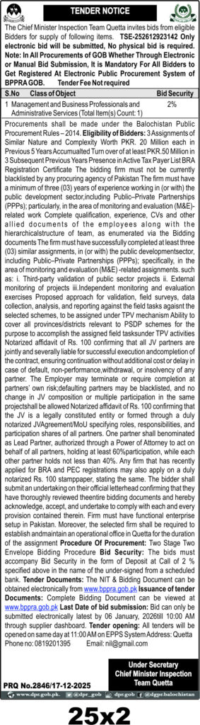 This tender invites bids for supply of management and business professionals and administrative services in Quetta under consultancy category. The procurement is for monitoring and evaluation related assignments with a focus on public-private partnerships.