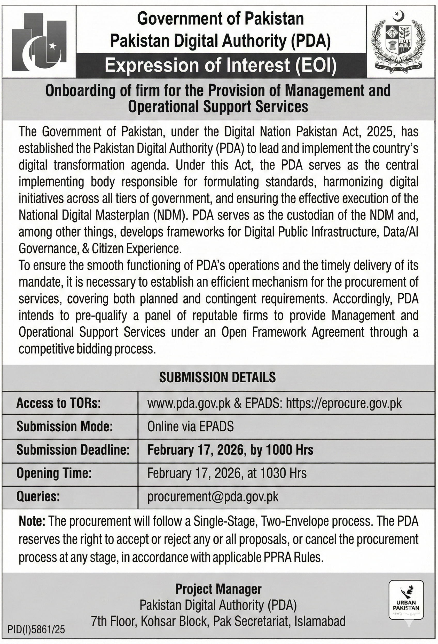 This tender invites firms to provide Management and Operational Support Services for the Pakistan Digital Authority (PDA) based in Islamabad. The PDA is spearheading the digital transformation agenda under the Digital Nation Pakistan Act, 2025, requiring expert support to ensure smooth operations and timely delivery of its mandate.