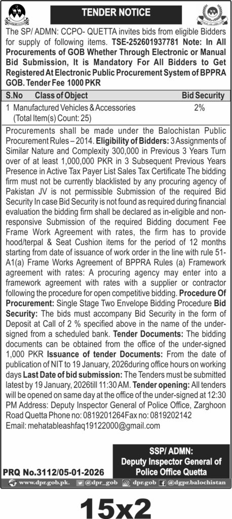 The submission deadline is set for 19 January 2026 at 11:30 AM, with tender opening at 12:30 PM on the same day at the Deputy Inspector General of Police Office, Zarghoon Road, Quetta. Interested bidders can obtain tender documents during office hours until 19 January 2026 upon payment of PKR 1000.