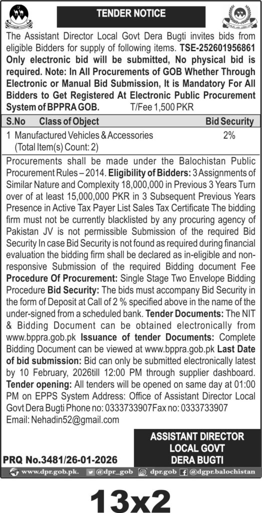 The submission deadline is set for 10 February 2026 at 12:00 PM, with electronic bids only accepted via the supplier dashboard. Tender opening will occur the same day at 1:00 PM on the EPPS system. The physical address for correspondence is the Office of Assistant Director Local Government Dera Bugti.