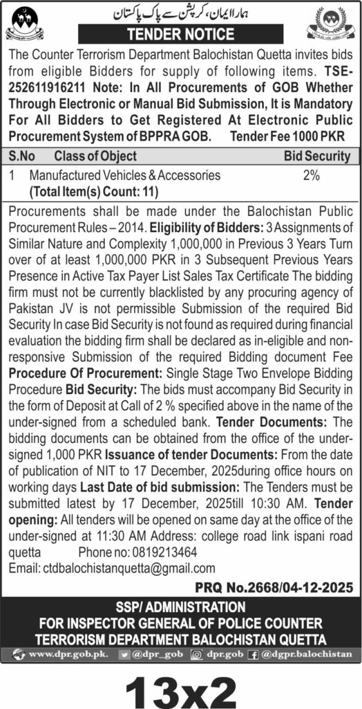 The Counter Terrorism Department Balochistan Quetta invites bids for supply of manufactured vehicles and accessories under Balochistan Public Procurement Rules 2014. The tender covers 11 items with mandatory registration on BPPRA electronic system. The procurement requires bidders to submit bids with 2% bid security and a tender fee of 1000 PKR. Bidding documents are available from the department office until 17 December 2025. Bids must be submitted by 10:30 AM on the closing date and will be opened at 11:30 AM the same day. Eligibility criteria include prior assignments, tax registration, and no blacklisting. JV participation is not allowed. Contact details include phone 0819213464 and email ctdbalochistanquetta@gmail.com.