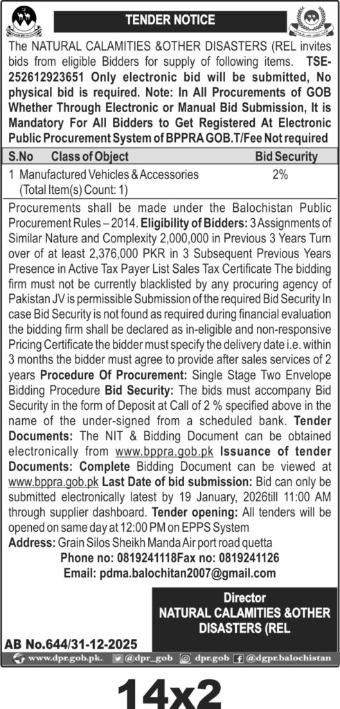 This tender invites bids for the supply of manufactured vehicles and accessories to support the Natural Calamities & Other Disasters department in Quetta, Balochistan. The procurement focuses on acquiring reliable vehicles essential for disaster response and management, ensuring operational readiness in challenging environments.