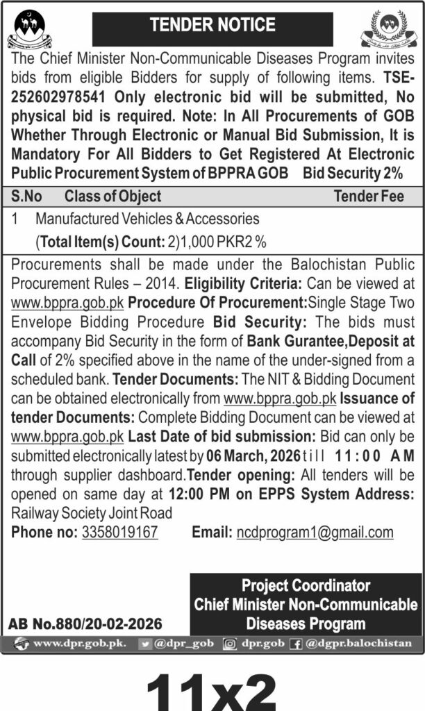 This tender invites bids for the supply of manufactured vehicles and accessories under the Chief Minister Non-Communicable Diseases Program in Quetta, Balochistan. The procurement focuses on acquiring two vehicles with related accessories, essential for program operations in the region. The vehicles must meet the specified standards to support the program's outreach and logistical needs effectively.