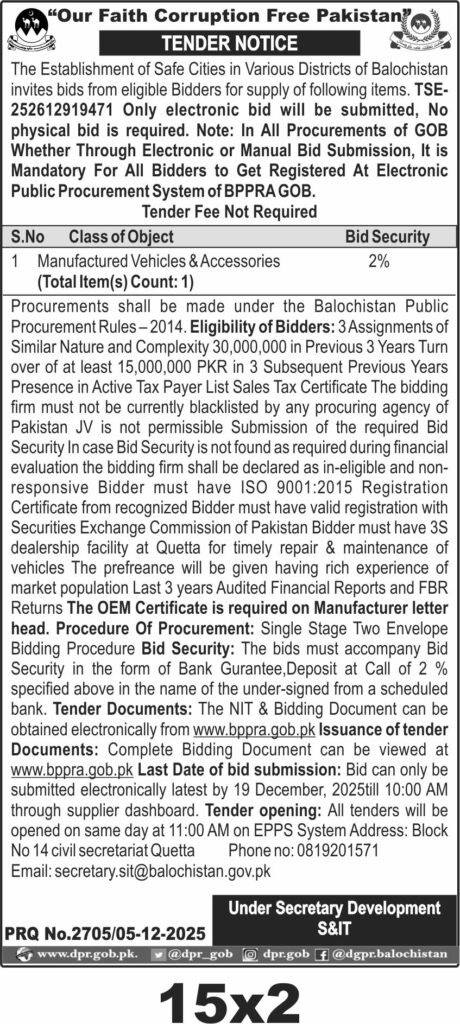 This tender invites bids for the supply of manufactured vehicles and accessories under the Safe Cities initiative in Quetta, Balochistan. The procurement falls under the vehicles and auto parts category and requires electronic bid submission only. The scope includes supply and maintenance of vehicles for various districts in Balochistan.