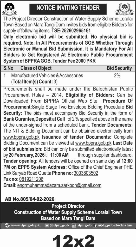 This tender invites bids for the supply of manufactured vehicles and accessories required for the Water Supply Scheme in Loralai Town, based on the Mara Tangi Dam project. The procurement is managed by the Project Director Construction of Water Supply Scheme Loralai Town, located in Quetta, Balochistan, focusing on vehicles essential for operational and logistical support.