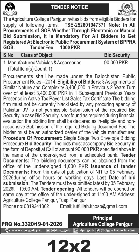 The submission deadline is set for 05 February 2026 at 10:00 AM, with tender opening at 11:00 AM the same day at Agriculture College Panjgur, Tusp, Panjgur. Bidding documents can be obtained for PKR 1,000 during office hours. The process requires sealed hard copy submission following the Single Stage Two Envelope procedure.