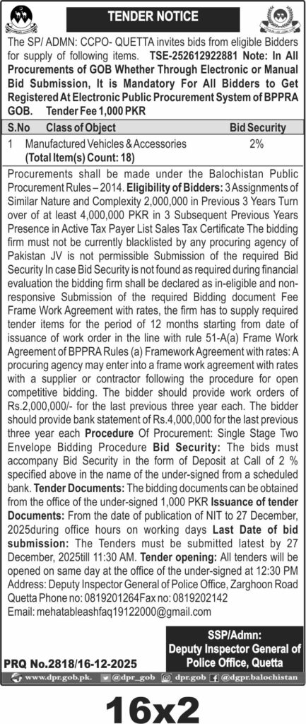 This tender invites bids for the supply of manufactured vehicles and accessories in Quetta under the category of vehicles and auto parts. The procurement is conducted by the Deputy Inspector General of Police Office, Quetta. The tender includes 18 total items with a bid security of 2 percent.