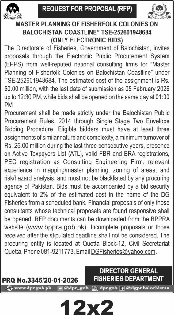 The submission deadline is set for 05 February 2026 at 12:30 PM, with bid opening scheduled for 01:30 PM the same day. Proposals must be submitted electronically via the Electronic Public Procurement System (EPPS). The Directorate of Fisheries office is located at Quetta Block-12, Civil Secretariat, Quetta.