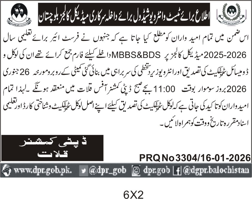This notice from the Deputy Commissioner Office Quetta invites candidates who have submitted forms for MBBS and BDS admissions for the academic year 2025-2026 to attend a document verification session. The verification is scheduled for 26th January 2026 at 11:00 AM in the Deputy Commissioner Office Quetta. Candidates must bring their original local certificates, domicile, and educational documents for authentication.