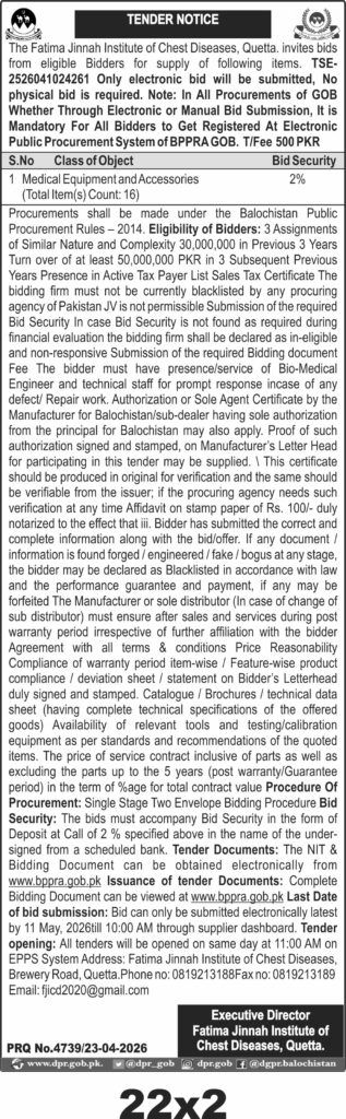 The tender documents can be obtained and viewed electronically at the BPPRA website. Bids must be submitted electronically only through the supplier dashboard by 11 May 2026 at 10:00 AM. Tender opening will occur the same day at 11:00 AM on the EPPS system. The contact office is located at Fatima Jinnah Institute of Chest Diseases, Brewery Road, Quetta. Phone and fax numbers are provided along with an email address for queries.