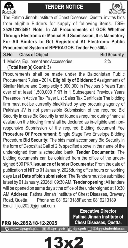 The Fatima Jinnah Institute of Chest Diseases in Quetta invites bids for supply of medical equipment and accessories under Balochistan Public Procurement Rules 2014. The tender covers three items with mandatory registration on BPPRA GOB electronic system. The procurement requires bidders to have prior experience with similar assignments and meet financial and tax compliance criteria. Bids must include 2% bid security and be submitted by 01 January 2026 at 09:30 AM with opening at 10:30 AM on the same day. Tender documents are available for a fee of 500 PKR from the institute office. JV participation is not allowed and blacklisted firms are ineligible. Contact details include phone 0819213188 and email fjicd2020@gmail.com.
