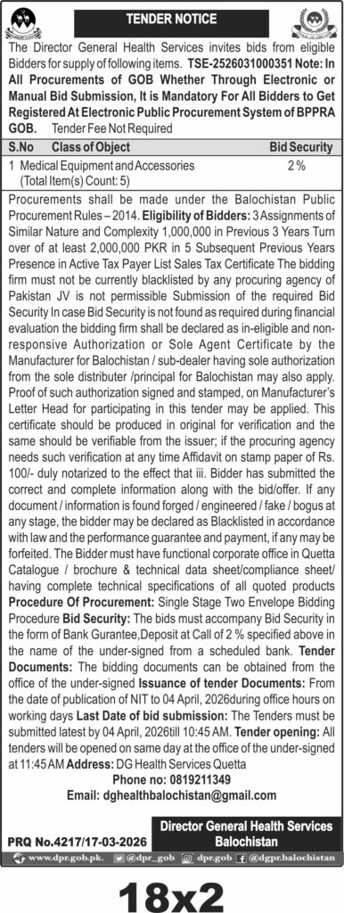 This tender invites bids for the supply of medical equipment and accessories in Quetta under the Director General Health Services Balochistan. The procurement focuses on essential medical items to support healthcare facilities in the region, ensuring quality and compliance with technical specifications.