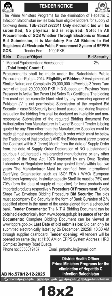 This tender invites bids for the supply of medical equipment and accessories in Quetta under the Hepatitis C elimination program. The procurement falls under the medical and surgical supplies category and requires electronic bid submission only. The tender is issued by the Prime Ministers Programs for the Elimination of Hepatitis C Infection Balochistan.