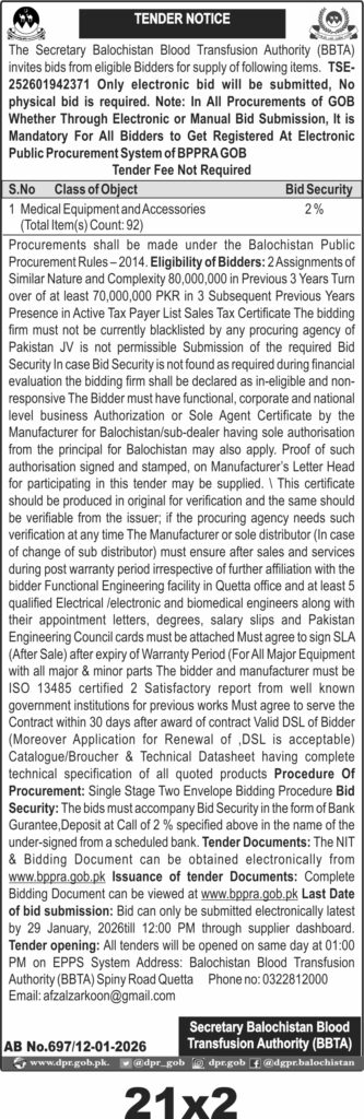 This tender invites bids for the supply of medical equipment and accessories to the Balochistan Blood Transfusion Authority in Quetta. The procurement covers a total of 92 items essential for the authority's operations, focusing on biomedical and electronic medical devices. The scope demands suppliers with proven experience and technical capacity to ensure quality and compliance with health standards.