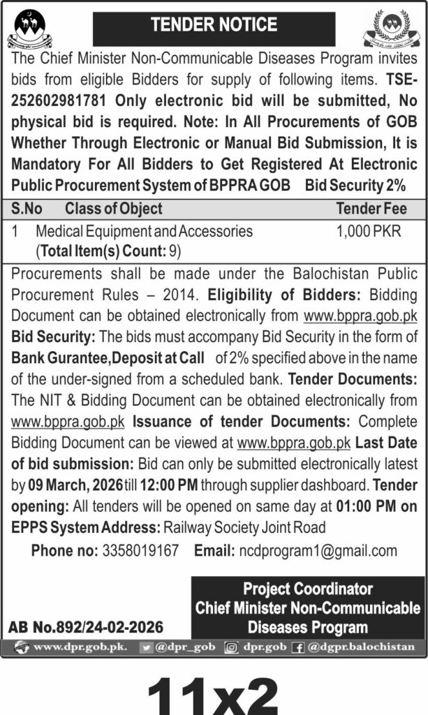 This tender invites bids from eligible suppliers in Quetta for the supply of medical equipment and accessories under the Chief Minister Non-Communicable Diseases Program. The procurement focuses on nine specific medical items essential for healthcare delivery in the region, ensuring quality and compliance with health standards.