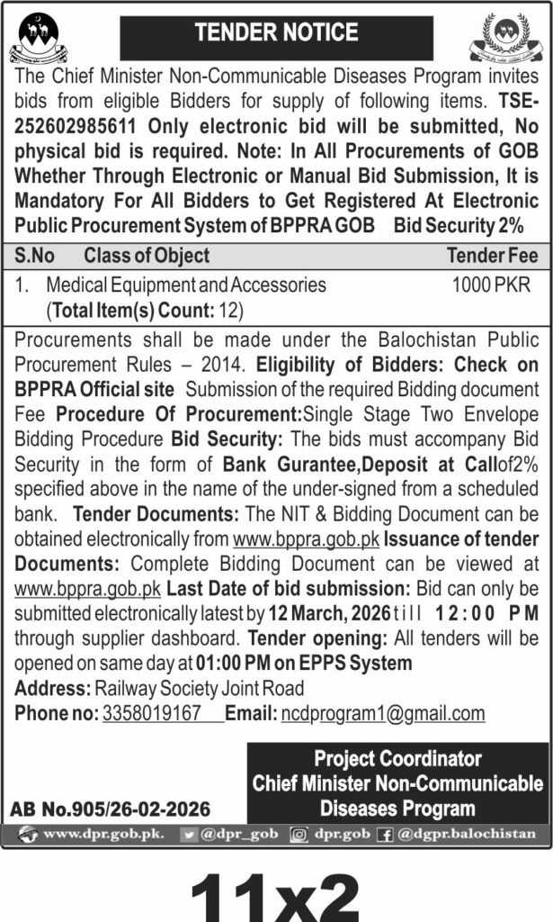 This tender invites bids from eligible suppliers in Quetta for the supply of medical equipment and accessories under the Chief Minister Non-Communicable Diseases Program. The procurement focuses on 12 key medical items essential for healthcare delivery in the region, ensuring quality and compliance with health standards.