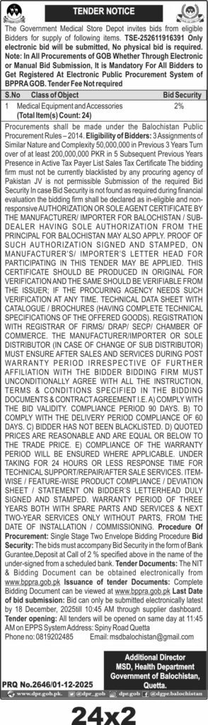 The Government Medical Store Depot Quetta invites electronic bids for supply of medical equipment and accessories under Balochistan Public Procurement Rules. The tender covers 24 items for medical and surgical supplies in Quetta city. Bidders must be registered and comply with eligibility criteria including financial turnover and tax compliance.