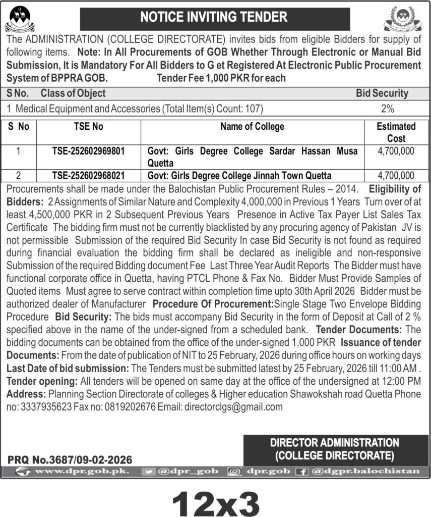 This tender invites bids for the supply of medical equipment and accessories to Girls Degree Colleges in Quetta under the Directorate of Colleges & Higher Education, Balochistan. The procurement focuses on delivering quality medical items to support educational institutions in Quetta, ensuring they are equipped with necessary healthcare tools and accessories.